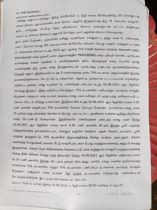 இது தொடர்பாக மனோகரின் உறவினர்களும் வாலாஜாபாத் காவல்நிலையத்தில் வழக்கு தொடர்ந்தனர். இந்த வழக்கின் அடிப்படையில் ஃபைனான்ஸ் ஊழியர்கள் அமர்நாத், கிருஷ்ணா, சரத்குமார், கார்த்திக் ஆகிய 4 பேர் மீது வழக்கு பதிவு செய்து வாலாஜாபாத் போலீசார் விசாரணை மேற்கொண்டு வருகிறார்கள்.