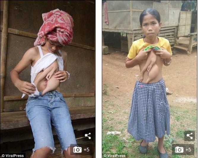 பிலிப்பைன்சின் Iligan பகுதியைச் சேர்ந்தவர் Veronica Cominguez. 14 வயது சிறுமியான இவருக்கு பிறக்கும் போதே மார்பகம் இருக்கும் பகுதிக்கு அருகே இரண்டு கைகள் வளர்ந்த நிலையில், வயிற்றுப்பகுதியில் ஒரு நீள்வட்ட வடிவில் உறுப்பு ஒன்று வளர்ந்த நிலையில் இருந்துள்ளது.
