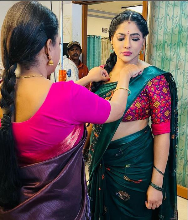 திருமண வாழ்க்கை சரியாக அமையாத நிலையில் கணவரைப் பிரிந்து வாழ்ந்து வரும் நடிகை ரேஷ்மா பசுபுலேட்டி தனது மகனைத் தன்னுடன் பார்த்துக்கொள்கிறார். இந்நிலையில் தற்போது அவர் இன்ஸ்டாகிராம் பக்கத்தில் வெளியிட்டுள்ள லேட்டஸ்ட் புகைப்படங்கள் ரசிகர்களின் கவனத்தை பெற்றுள்ளன. பச்சை நிற புடவையை கட்டிக் கொண்டு சூட்டிங் ஸ்பாட்டில் எடுத்துக்கொண்ட போட்டோக்களை ஷேர் செய்துள்ளார்.