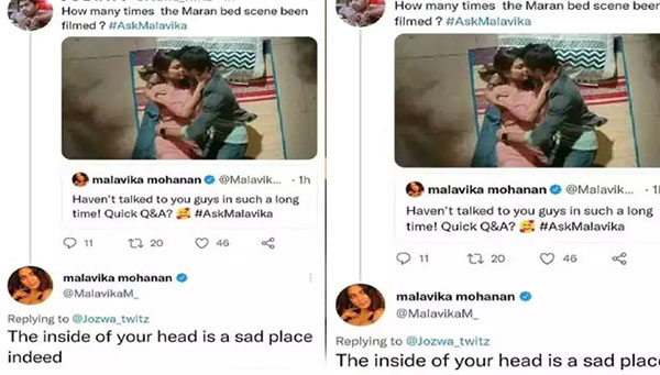 ரசிகர் ஒருவர் மாறன் படத்தில் தனுசு உடனான படுக்கையறை காட்சி எத்தனை முறை படமாக்கப்பட்டது என்று கேள்வியை கேட்டு இருந்தார். இதற்கு கடுப்பான மாளவிகா மோகனன் உங்கள் மண்டைக்குள் மோசமான எண்ணம் உடைய இடம் இருக்கிறது என காட்டமாக பதில் அளித்துள்ளார்.