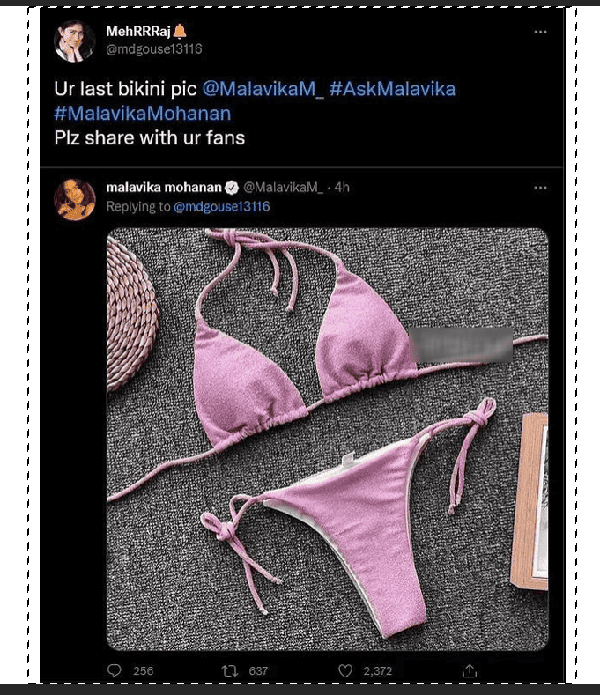 இந்நிலையில், இன்ஸ்டாகிராம் பக்கத்தில் எப்போதும் ஆக்டிவாக இருந்து புகைப்படங்களால் மயக்கி வரும் மாளவிகாவிடம் ரசிகர் ஒருவர் பிகினி புகைப்படத்தை கேட்டுள்ளார். அதற்கு மாளவிகா உள்ளாடையை கீழே வைத்தபடி எடுத்த எடுத்த பிகினி ஆடை புகைப்படத்தை பகிர்ந்து பதிலடி கொடுத்திருக்கிறார்.