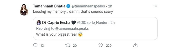 பின் ரசிகர்களுடன் உறையாடிய தமன்னா கேள்விகளுக்கு பதிலளித்து வந்தார். அந்த வகையில், ஒரு ரசிகர் எதற்கு அதிகமாக பயப்படுவீர்கள்.? என்று கேட்டதற்கு தமன்னா, நான் அதிக சவுண்டிகற்கும், ஞாபக மறதிக்கும் அதிகம் பயப்படுவேன் என்று பதிலளித்துள்ளார்.