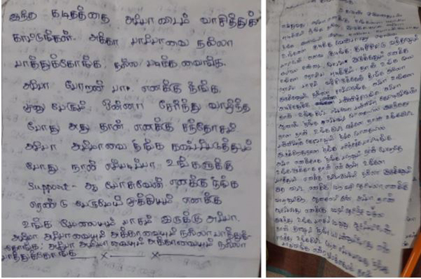 அப்பா, அம்மாவை நீங்க கஷ்டப்படுத்தும்போது, நான் எப்படிப்பா உங்களுக்கு support-ஆ பேசுவேன். எனக்கு நீங்க ரெண்டு பேருமே முக்கியம். எனக்கு உங்க மேலயும் பாசம் இருக்கு அப்பா. அம்மா அப்பாவையும், அக்காவையும் நல்லா பாத்துக்கோங்க. அப்பா அம்மாவையும், அக்காவையும் நல்லா பாத்துக்கோங்க’ என எழுதப்பட்டிருந்தது.