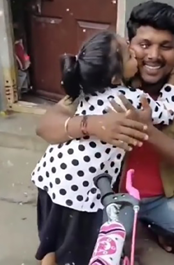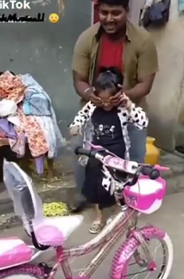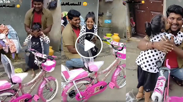 உடனே சவாரி முடிந்து வீட்டுக்கு வரும்போது தன் செல்ல மகளுக்கு சைக்கிள் வாங்கி வந்தார். வீட்டுக்கு வந்ததும், குழந்தையின் கண்ணை பொத்திக்கொண்டு வாசலுக்கு அழைத்து வந்தார் தந்தை. சைக்கிளைப் பார்த்ததும் அந்த குழந்தையின் முகத்தில் சந்தோசத்தைப் பார்க்கவேண்டுமே? கூடவே தன் ஆசை அப்பாவை கட்டிப்பிடித்து நச்சென ஒரு முத்தமும் கொடுக்கிறாள் இந்த சுட்டிதேவதை. இதோ நீங்களே பாருங்களேன்.