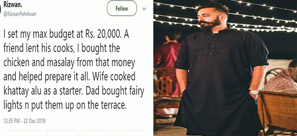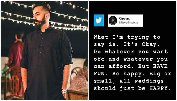 இந்நிலையில் ரிஸ்வன் பெயில்வான் என்ற நபர் தனக்கு சமீபத்தில் நடந்த திருமணத்தை சுவாரசியமாக டுவிட்டரில் தெரிவித்துள்ளார். அதில், என் திருமணம் எங்கள் வீட்டு மொட்டை மாடியில் தான் நடந்தது. இதில் என் பெற்றோர், நண்பர்கள் உட்பட 25 பேர் கலந்து கொண்டனர்.