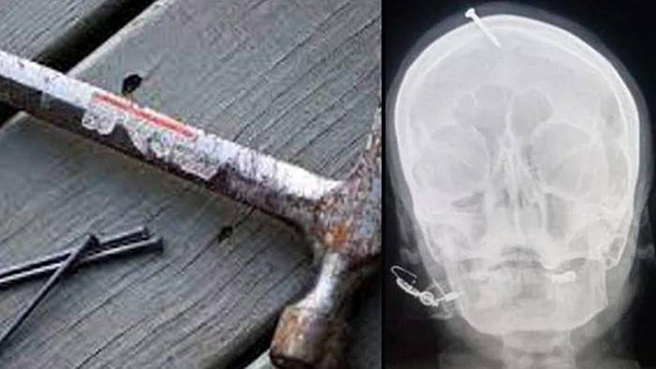 இதைப்பார்த்து மருத்துவர்கள் அதிர்ச்சியடைந்து, தலையில் ஏன் ஆணி அடிக்கப்பட்டுள்ளது என்பது குறித்து கேட்டுள்ளனர்.