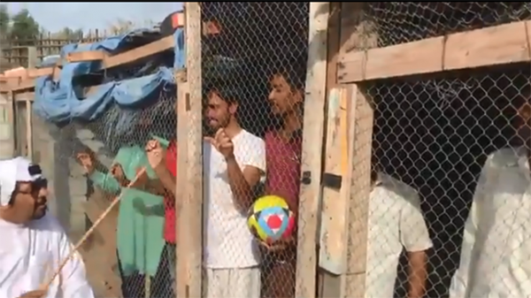 அபுதாபியில் நடந்த ஆசிய கால்பந்து தொடரின் நேற்றைய ஆட்டத்தில் இந்திய அணி 2-0 என்ற கோல் கணக்கில் தோற்றது. இந்நிலையில், போட்டு தொடங்குவதற்கு முன்பாக வீடியோ ஒன்று வெளியானது. அந்த வீடியோவில், சில இந்தியர்களைப் பறவைக் கூண்டில் அடைபட்டுக் கிடக்கின்றனர்.