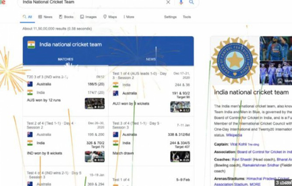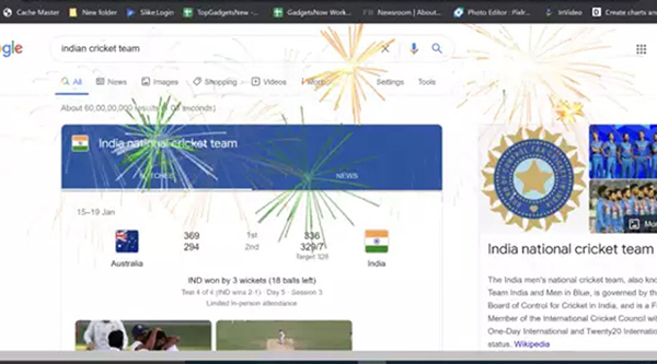 India National Cricket Team என்ற சொற்தொடரைக் கொண்டு கூகுள் தேடல் செய்யும்போது இந்த வாணவேடிக்கை அனிமேஷன் காண்பிக்கப்பட்டுள்ளது.