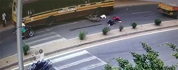 அப்போது பேருந்து, லா ரி ஆகிய இரு வாகனங்களுக்கு இ டை யில் சி க் கிய இ ளை ஞர் த டு மா றிய வி ழு ந்த நி லை யில், இ ரு இ ளம் பெ ண்க ள் மீ து ம் கண் இ மை க்கும் நே ர த்தில் லா ரி ஏ றி இ ற ங்கி ய து.