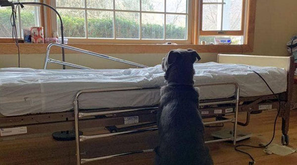 நியூஜெர்ஸி மாகாணத்தை சேர்ந்த மூன்று வயதான மூஸ் என்கிற வளர்ப்பு நாய், தனது உரிமையாளரின் மருத்துவமனை படுக்கையின் பக்கத்திலேயே பொறுமையாக காத்துக்கொண்டிருக்கிறது.