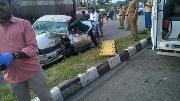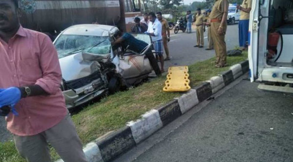 கார் விழுப்புரம் மாவட்டம் உளுந்தூர்பேட்டையை அடுத்த எடைக்கல் எனுமிடத்தில் செல்லும்போது, சாலையோரம் பழுதாகி நின்ற லாரி மீது திடீரென்று மோதி விபத்துக்குள்ளானது. இதில் ராதா, அம்பரீஷ் ஆகியோர் சம்பவ இடத்திலேயே உயிரிழந்தனர். மேலும் அவரது தாய் தங்கம், மகள் சோனியா, சிட்லபாக்கத்தைச் சேர்ந்த கார் ஓட்டுநர் கோகுல், லாரியை பழுது பார்த்துக் கொண்டிருந்த மெக்கானிக் சந்திரபாபு ஆகியோர் காயமடைந்தனர்.