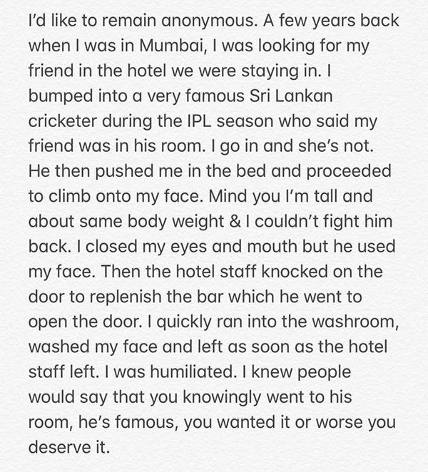 அதில், சில ஆண்டுகளுக்கு முன்னாள் நான் மும்பையில் இருந்தேன். அப்போது நான் தங்கியிருந்த ஹொட்டலில் என் தோழியும் தங்கியிருந்ததால் அவரை தேடினேன். அப்போது ஐபிஎல் சீசனில் பிரபலமாக இருந்த இலங்கை வீரர் என்னிடம் வந்து உங்கள் தோழி என் அறையில் இருப்பதாக கூறினார்.