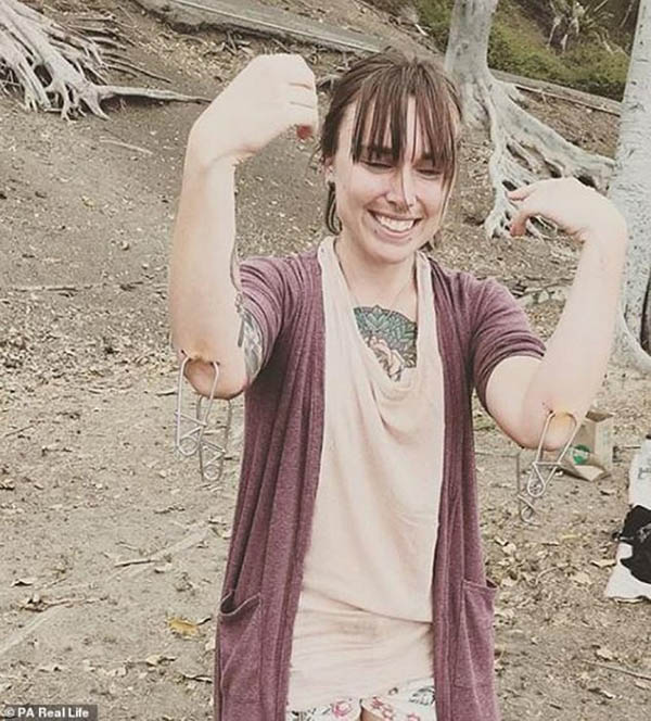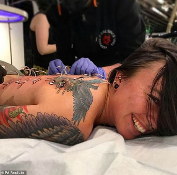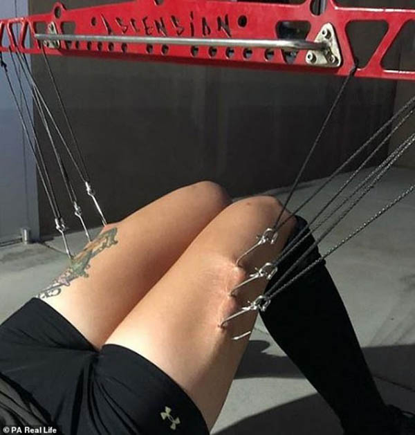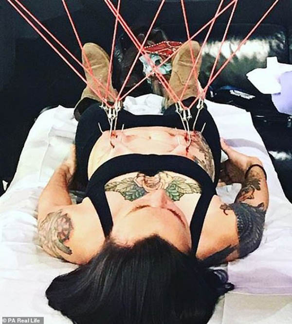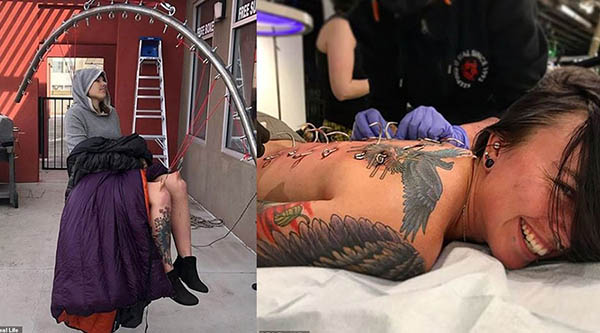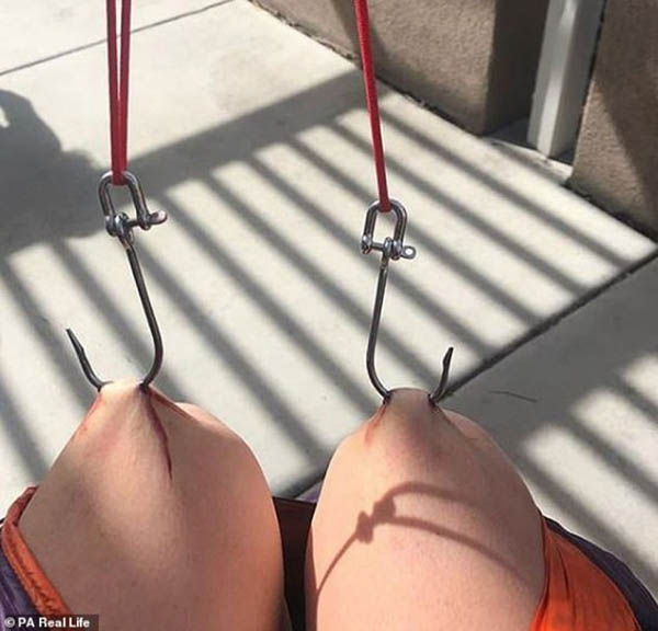 அமெரிக்காவில் வாழும் ஒரு பெண், தன் உடலில் இரும்புக் கொக்கிகளை குத்திக் கொண்டு தொங்குவது தனக்கு இன்பம் அளிப்பதாக தெரிவித்துள்ளார்.