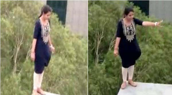 அந்த பெண் மாடி சுவற்றின் நுனியில் நின்றிருந்ததால் அவர் கீழே விழுந்துவிடுவாரோ என பலரும் பயந்தனர்.