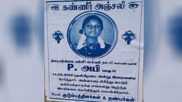 இது தொடர்பாக விளக்கமளித்த அமராவதி, சந்தோஷுக்கு ஏற்கனவே திருமணமாகி ஒரு குழந்தை உள்ள நிலையில் அவனை தனது மகள் அபி காதலித்து ஓடிபோனதால், அவள் உ யிரிழந்துவிட்டதாக அறிவிக்க கண்ணீர் அஞ்சலி போஸ்டர் ஒட்டியதாகவும் மேற்கொண்டு எதுவும் பேச விரும்பவில்லை என்றார்.