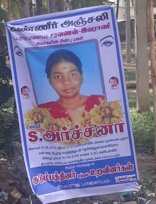 இந்நிலையில் எங்களது மகள் அர்ச்சனா அகால மரணமடைந்தார் என்பதை ஆழ்ந்த வருத்தங்களுடன் பகிர்ந்துக் கொள்கிறோம். இவரது பூவுடல் 10.6.2019ம் திகதி மதியம் 3.30 மணியளவில் நல்லடக்கம் செய்யப்படும் என பேனர் பிரிண்ட் செய்து அதை தெருவில் கட்டி வைத்துள்ளார் சரவணன்.