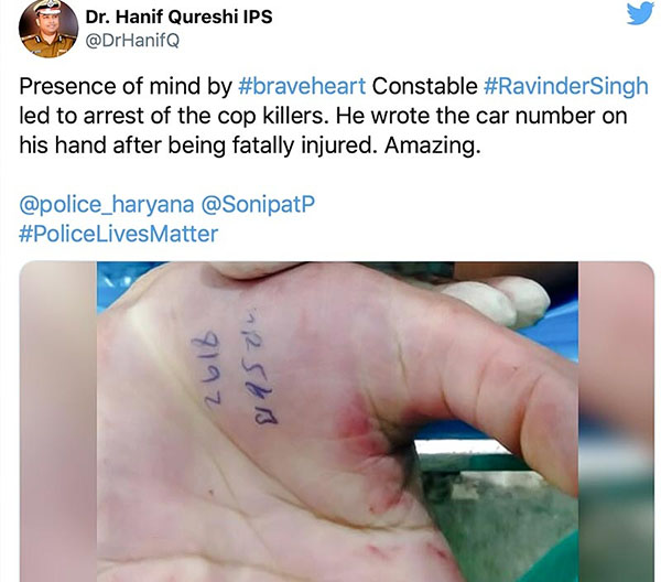 இதுகுறித்து அந்த மாவட்ட எஸ்பி தனது டுவிட்டரில் கூறியபோது ’உயிர் போகும் நேரத்திலும் தனது கடமையை சரியாக செய்யும் வகையில் புத்திசாலித்தனமாக குற்றவாளியின் வண்டி எண்ணை தனது உள்ளங்கையில் குறித்து வைத்துள்ள அவரது நடவடிக்கை மெய்சிலிர்க்க வைக்கின்றது. அவர் குறித்து வைத்த வண்டி எண் உதவியால் குற்றவாளிகளை எளிதில் பிடிக்க முடிந்தது என்று கூறினார். மேலும் அவருக்கு வீர பதக்கம் பெற்றுத் தர பரிந்துரை செய்யப்படும் என்றும் கூறியுள்ளார்