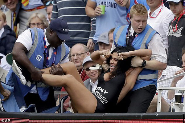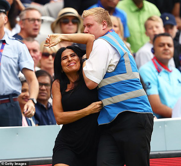 இங்கிலாந்தின் லோர்ட்ஸ் மைதானத்தில் கிரிக்கெட் உலகக்கிண்ணம் இறுதிப்போட்டி நடைபெற்றது. இந்த நிலையில் எலெனா வுலிட்ஸ்கி என்ற பெண்மணி ஆ பாச இணைய தளம் ஒன்றின் முகவரி பொறிக்கப்பட்ட முகம் சுழிக்கவைக்கும் ஆடையுடன் மைதானத்திற்குள் புகுந்துள்ளார்.