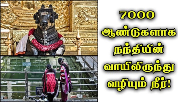 நந்தியின் வாயிலிருந்து வரும் நீர் எங்கிருந்து வருகிறது என்பது இதுவரை யாராலும் கண்டுபிடிக்கப்படவில்லை என்பது குறிப்பிடத்தக்கது. மேலும் சிவ பெருமானின் மீது வழிந்த பின் இந்த நீர் அருகிலிருக்கும் குளத்தை சென்றடைவது போல் இந்த கோயிலின் கட்டுமானம் வடிவமைக்கப்பட்டுள்ளது.