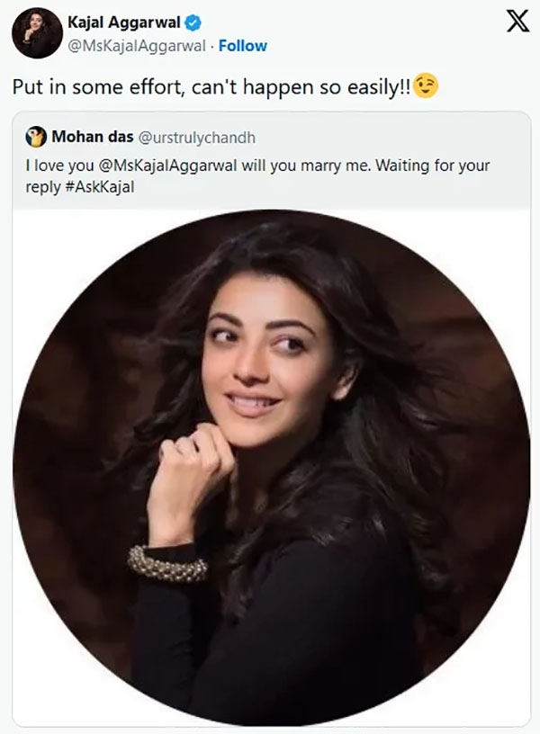 காஜல் அகர்வால் அவ்வப்போது ரசிகர்களுடன் கலந்துரையாடுவார். அப்போது, ஒரு ரசிகர் உங்களை லவ் பண்றேன். நாம் கல்யாணம் பண்ணிக்கலாம். உங்க ரிப்ளைக்காக வெயிட் பண்றேன். என்று பதிவிட்டு இருந்தார். இதனை பார்த்த காஜல் அகர்வால் கொஞ்சம் முயற்சி பண்ணுங்க.. மிகவும் எளிதாக இது நடந்து விடாது என்று பதில் அளித்துள்ளார்.