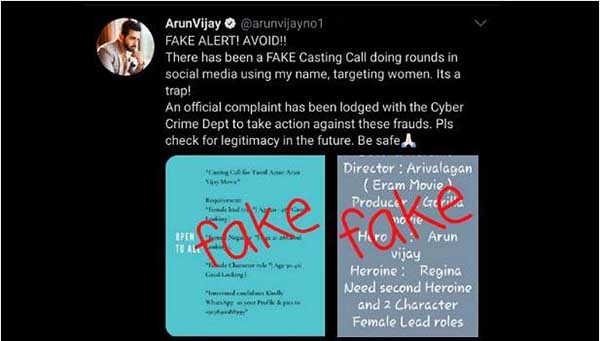 இதனால் பதறிப்போன அருண் விஜய் உடனடியாக தனது ட்விட்டர் பக்கத்தில் இதுபோன்ற பொய்யான அறிவிப்புகளில் பெண்கள் மாட்டிக்கொள்ளாதீர்கள் என அதிகாரப்பூர்வமாக தன்னுடைய பக்கத்தில் அறிவித்துள்ளார்.