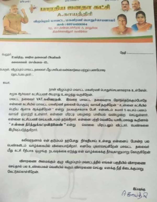 விழுப்புரம் மாவட்டம் கண்டாச்சிபுரம் பகுதியை சேர்ந்த, பா ர தி ய ஜ ன தா க ட் சி யின் விழுப்புரம் மாவட்டம் மகளிரணி பொ துச்செ ய லாளர் காயத்ரி என்பவர், விழுப்புரம் மாவட்ட பா ர தி ய ஜ ன தா க ட் சியின் மா வ ட்ட த லை வரும், மு ன் னாள் ச ட் ட ம ன் ற உ று ப்பினருமான VAT. கலிவரதன் மீ து, பா லி ய ல் வ ன் கொ டு மை ம ற் றும் ப ண மோ ச டி தொ ட ர்பாக பு கா ர் ஒ ன் றை த ன து லெ ட் டர் பே டி ல் அ னு ப் பி யதாக ச மூ க வ லை த ள ங்களில் ப ர விய பு கை ப்படம் இ ப் ப கு தியில் கா ட் டு தீ யா ய் ப ர வி வ ரு கி றது.