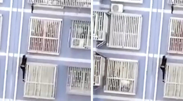 இதைக் கண்ட Zhang Xin என்னும் முதியவர் படிக்கட்டுகள் வழியே சென்றால் கால தாமதமாகி விடலாம் என்று எண்ணி கட்டிடத்தின் வெளிப்புற ஜன்னல்கள் வழியே படபடவென ஏறி சென்று குழந்தையை மீட்டார்.