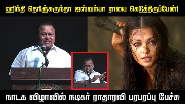 நடிகர் சங்கமும் இதற்கு விரைவில் முடிவு எடுக்கும் என கூறப்படுகின்றது, இந்நிலையில் சில வருடங்களுக்கு முன்பு ‘எனக்கு ஹிந்தி தெரிந்திருந்தால் நான் ஐஸ்வர்யா ராயை கெடுத்து இருப்பேன்’ என்று ராதாரவி கூறினார்.