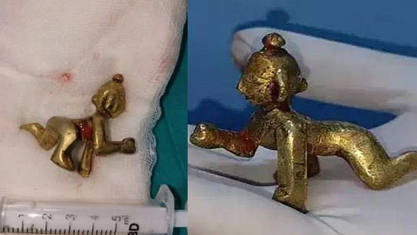 அதில், அவரது தொண்டையிலுள்ள உணவு குழாயில் இரும்பு வடிவிலான பொருள் ஒன்று சிக்கியுள்ளது தெரிந்தது. பின்னர் இது குறித்து அவரிடம் விசாரித்த போது, தான் எதையும் உட்கோள்ளவில்லை என்று தெரிவித்தார். தொடர்ந்து அவரிடம் கேட்கையில், தான் வழக்கமாக அருகிலிருக்கும் ஒரு கோயிலில் நீராடி, அந்த நீரை பருகுவதாக தெரிவித்தார்.