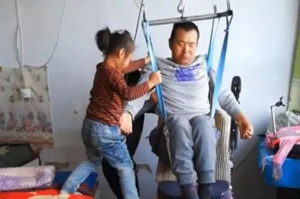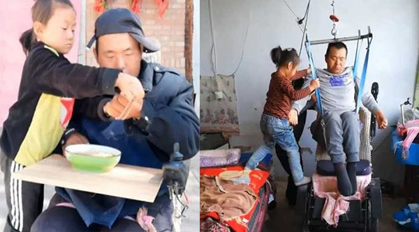 சீனாவில் பக்கவாதத்தால் பாதிக்கப்பட்டிருக்கும் தந்தையை அவரது ஆறு வயது மகள் கண்ணும் கருத்துமாய் பார்த்து கொள்ளும் சம்பவம் நெகிழ்ச்சியை ஏற்படுத்தியுள்ளது.