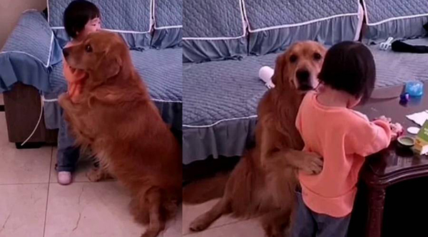 நாய் குழந்தையை திட்ட வேண்டாம் என்ற படி முகபாவனைகளுடன் சிறுமியின் பக்கத்தில் சென்று கட்டியணைத்தது.