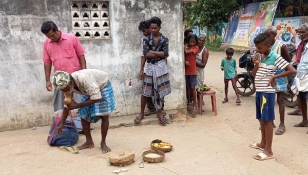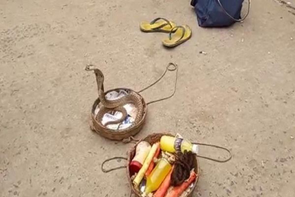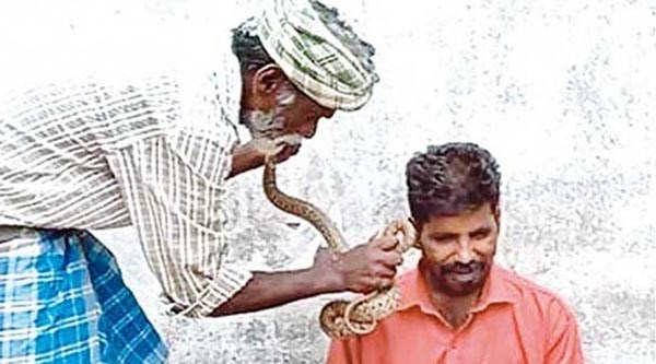 அப்போது அந்த பாம்பாட்டி 100 ரூபாயை வாங்கிக் கொண்டு அதிக விஷத்தன்மை கொண்ட நல்ல பாம்பை கையில் சுற்றி கருவளையத்தை நீக்குவதற்கு அவர்களது முகத்தில் தேய்த்தார்.