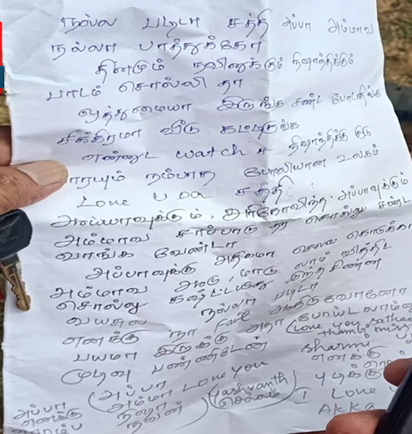 அதில் தன்னுடைய பெற்றோரை நன்றாக பார்த்துக்கொள்ள வேண்டும், சகோதர சகோதரிகளை நன்றாக படிக்க வைக்க வேண்டும் என எழுதப்பட்டிருந்தது.