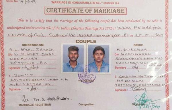 இவர்களின் மகன் அப்சல் ஜெனிஷ் (22). சென்னையில் உள்ள தனியார் கல்லூரியில் படித்த நிலையில் உடன் படித்த சுரேகா என்பவரை காதலித்துள்ளார். இவர்கள் காதலுக்கு எதிர்ப்பு கிளம்பிய நிலையில் வீட்டை விட்டு ஓடிய ஜோடி கடந்த 25ஆம் திகதி பதிவு திருமணம் செய்து கொண்டனர்.
