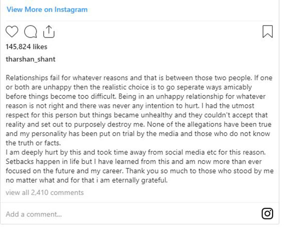 காதல் முறிவிற்கு பிறகு தர்ஷன் வெளியிட்ட உருக்கமான கடிதம் : என்ன சொன்னார் தெரியுமா?