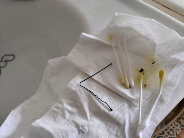 மேலும் காதுக்குள் ஏதோ சத்தம் கேட்டு கொண்டே இருந்ததோடு வாந்தி மற்றும் தலைசுற்றுவது போல உணர்வு ஏற்பட்டது. பின்னர் காது குடையும் பஞ்சால் செய்யப்பட்ட பட்ஸ் (cotton bud) மற்றும் குண்டூசியை காதுக்கு உள்ளே விட்டு வெளியில் எடுத்த போது அவருக்கு அதிர்ச்சி ஏற்பட்டது.
