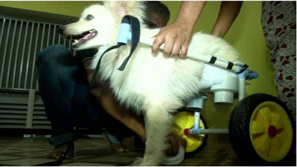 நாய்க்கு பின்னங்கால்கள் இல்லத்தை காயத்திரியின் தந்தை நாய் எளிதாக நடப்பதற்கு எதுவாக சக்கர நாற்காலியாக் தயாரிக்க முடிவு செய்தார்.நாயின் இரண்டு பின் கால்களுக்கு பதிலாக இரண்டு சக்கரம் பொருத்தப்பட்டுள்ளது.அது இலகுவாக இருப்பதற்காக பிவிசி பைப்களுடன் இணைக்கப்பட்டுள்ளது.