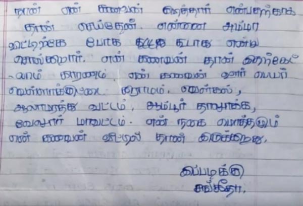 இதுகுறித்து தகவலறிந்த காவல்துறையினர், சம்பவ இடத்துக்கு சென்று சடலத்தை மீட்டதோடு அவர் எழுதி வைத்திருந்த கடிதத்தையும் மீட்டனர். அதில், நான் என் கணவர் குடித்தார் என்பதற்காக தான் செய்தேன், என் கணவர் தான் இதற்கெல்லாம் காரணம் என்றும் தனது கணவரின் ஊர் பெயர் மற்றும் அவரின் நகைகள் கணவரிடம் இருப்பதாகவும் எழுதியிருந்தது.