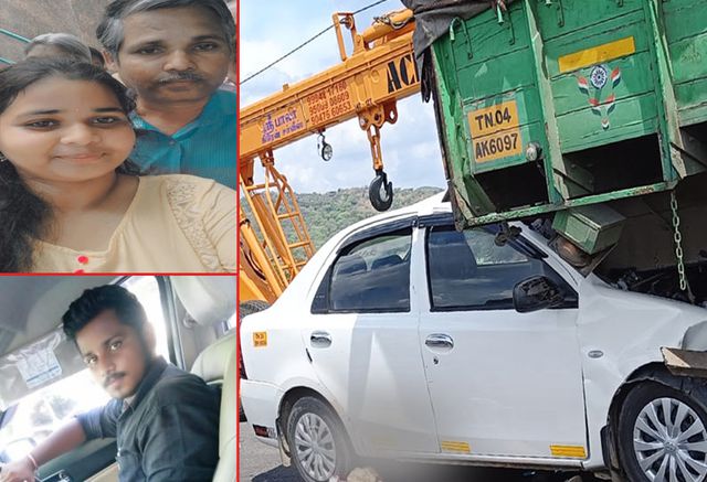 காரினை பிரகாஷ் ஓட்டி வந்துள்ளார். இவர்களது கார் திண்டுக்கல் மாவட்டம், அய்யலூர் மேம்பாலத்தில் கொண்டிருந்தபோது முன்னாள் சென்ற சரக்கு லாரியின் பின்பகுதியில் திடீரன்று பயங்கரமாக மோதியது.