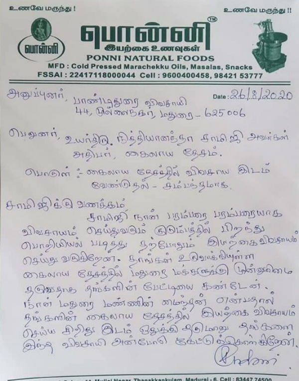 நான் மதுரை மண்ணின் மைந்தன் என்பதால் தங்களின் கைலாய தேசத்தில் இயற்கை விவசாயம் செ ய் ய அனுமதி கோருகிறேன் என்று எழுதி உள்ளார்.. இந்த லெட்டரும் சோஷியல் மீடியாவில் வைரலாகி வருகிறது.