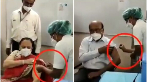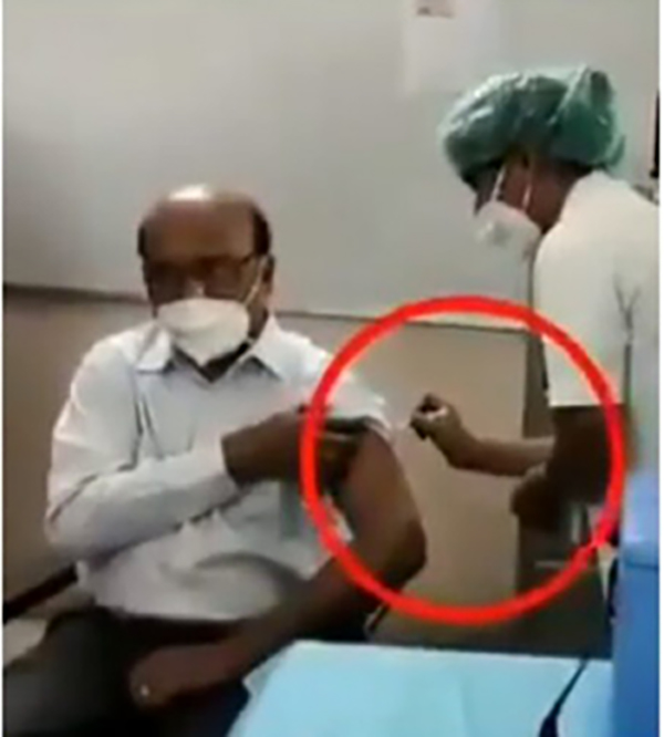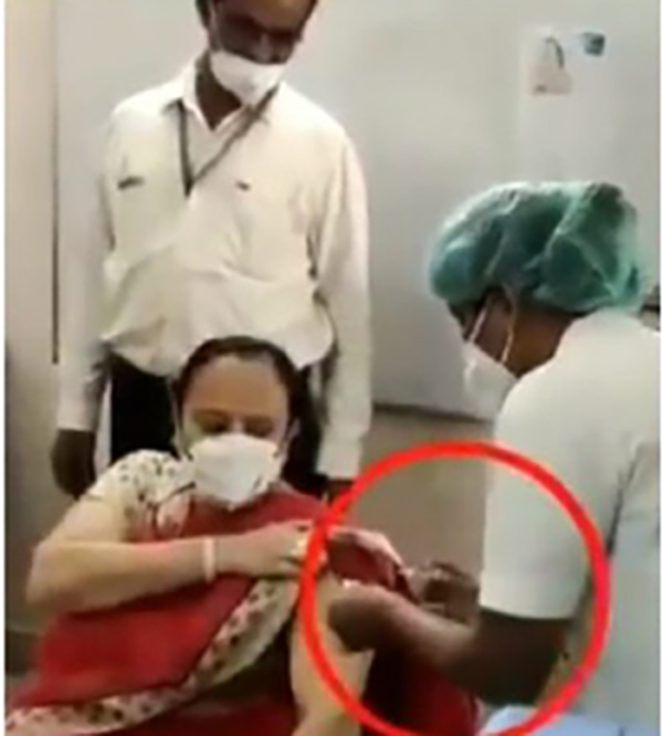அந்த வீடியோவில், அதிகாரி ஒருவர் கொரோனா தடுப்பூசி செலுத்திக் கொள்ள இருக்கையில் அமருகிறார். அங்கு இருக்கும் செவிலியர், ஊசியை உள்ளே செலுத்தாமல் அவர் அருகில் வைத்துக் கொண்டு போட்டோவுக்கு போஸ் கொடுக்கிறார்.