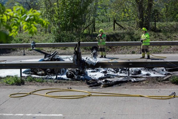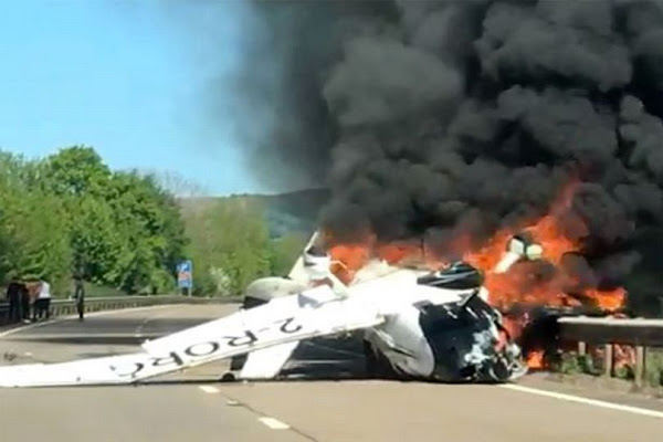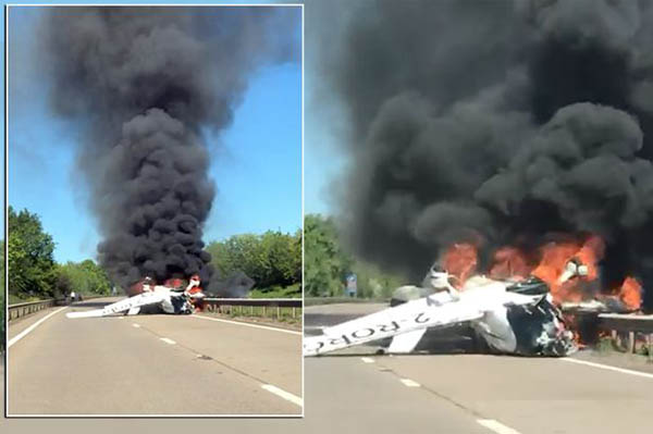 மட்டுமின்றி உடனையே அந்த விமானமானது தீ பற்றியது. மேலும், அவசர அவசரமாக சாலை நடுவே தரையிறங்க முயற்சி மேற்கொள்கையில் விமானம் வெடித்து கொழுந்துவிட்டெரியத் துவங்கியுள்ளது.