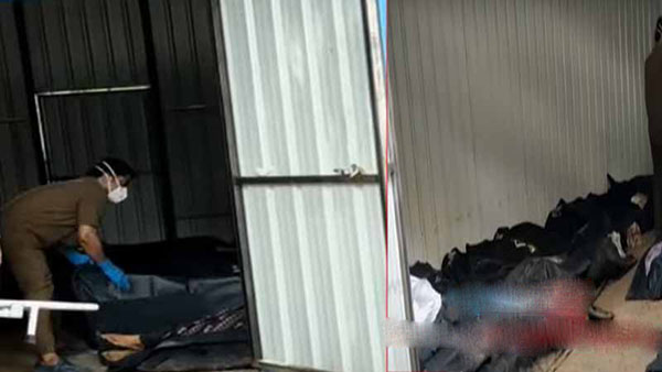 தினமும் கொரோனவால் உ.யி.ரி.ழப்போரின் எண்ணிக்கையால் இந்த தற்காலிக பி.ண.வ.றையில் உ.ட.ல்கள் குவிந்து உள்ளது. இந்த காட்சி ம.ரு.த்.து.ம.னைக்கு வருவோரின் நெ.ஞ்.சை உலுக்கும் காட்சியாக உள்ளது.