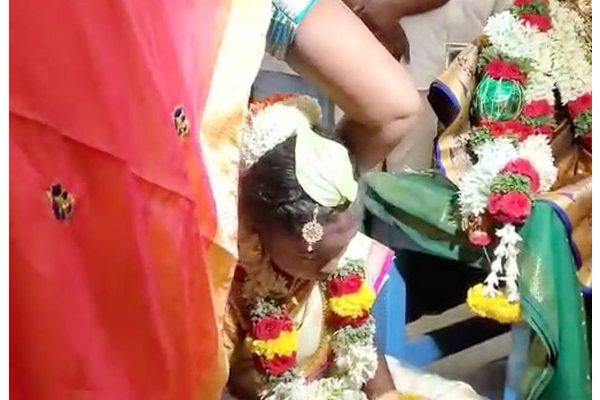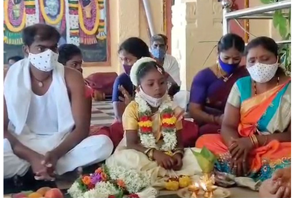 கோவில் அர்ச்சகர் வேத மந்திரங்களை ஓதி தாலி கயிறை எடுத்து சிறுமியின் கழுத்தில் தொட்டு, பின்னர் உற்சவரின் திருவடியில் வைத்து ஆசி பெற்று சிறுமியின் தாயிடம் கொடுத்தார்.