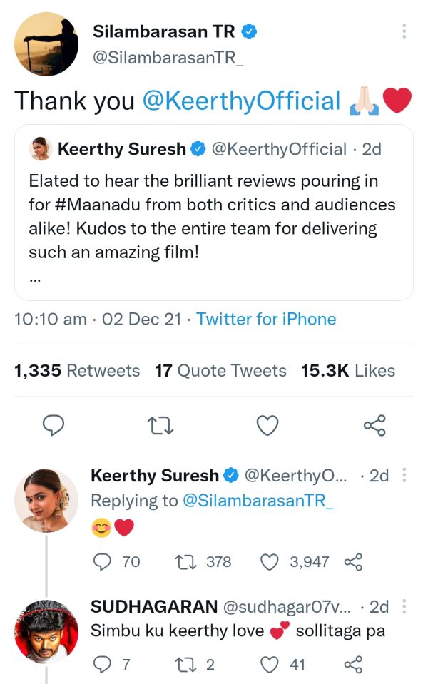 அந்த வகையில் சமீபத்தில் நடிகை கீர்த்தி சுரேஷ் மாநாடு படத்தை பார்த்துவிட்டு தனக்கு மிகவும் பிடித்ததாக சிம்புவை குறிப்பிட்டு ஒரு பதிவு போட்டிருந்தார். அதற்கு சிம்புவும் நன்றி தெரிவித்து ஒரு பதிவை வெளியிட்டார்.