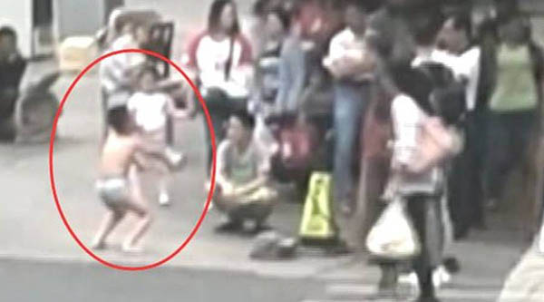 சீனாவின் Guizhou மாகாணத்தின் Guiyang பகுதியில் இருக்கும் மக்கள் பரபரப்பு மிகுந்த சாலையில் பள்ளி சிறுவன் ஒருவன் ஆடை இல்லாமல் உள்ளாடையுடன் கையை சற்று உயர்த்தி நின்ற படி நின்று கொண்டிருந்தான்.