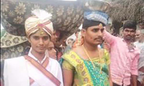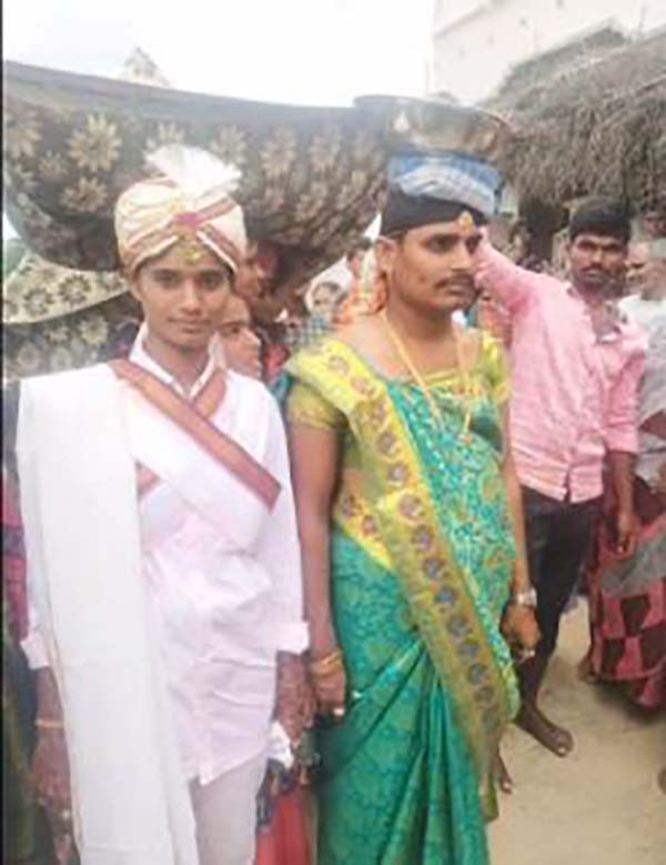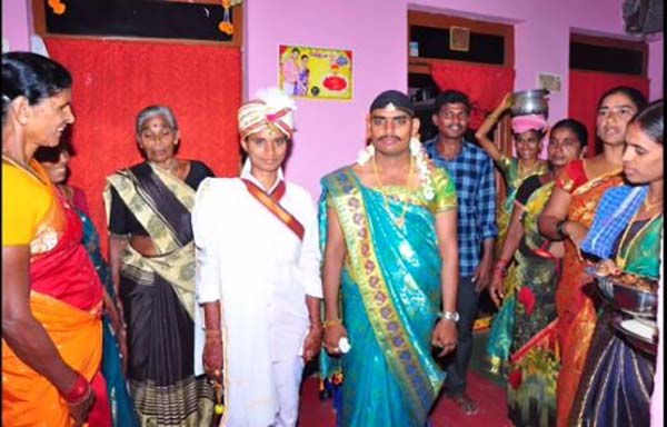 மணமகள் மணமகன் கோலத்திலும் மணமகன் மணமகள் கோணத்திலும் திருமணம் செய்து கொண்ட நிகழ்வு ஆந்திராவில் அரங்கேறியுள்ளது.
