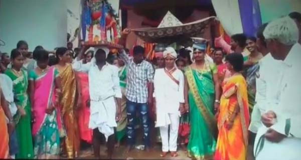 மணமகன் மணமகள் கோலத்திலும், மணமகள் மணமகனைப் போலவும் தயாராகி, திருமண சடங்குகள் நிறைவேற்றப் பட்டதே இதற்குக் காரணம். இந்தப் பகுதியில் மர்காபுரம் மண்டலம், தரிமடுகு, குரிச்செடு மண்டலம், தேஷினேனி பல்லி, அர்த்தவீடு மண்டலம், மாவுட்டூர், கம்பம் மண்டலம், ஜங்கங்குண்ட்லா கிராமங்களில், குலதெய்வ முறைப்படி நிச்சயம் செய்த தம்பதியின,ர் திருமண நாளில் மணமகன் மணமகள் கோலத்திலும் மணமகள் மணமகன் கோலத்திலும் உடை அணிந்து வந்து, குலதெய்வ கோவில் முன்பாக திருமணம் செய்து கொள்வது வழக்கம்.