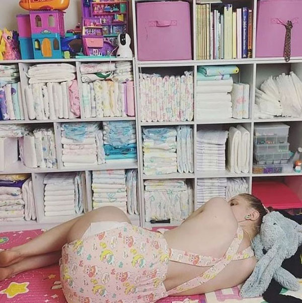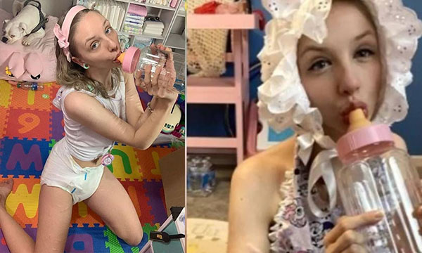 டயபர் அணிந்து கொண்டு தொட்டிலில் தூங்கி குழந்தையாக வாழும் 25 வயது அழகிய இளம்பெண்!!