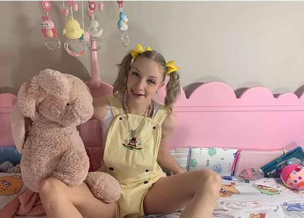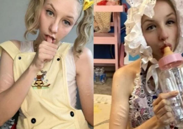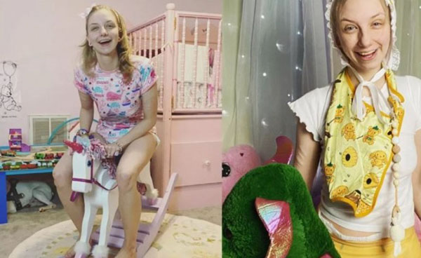 அமெரிக்காவில் வசிக்கும் 25 வயது இளம்பெண், குழந்தை போல டயபர் அணிந்து கொண்டும், தொட்டிலில் தூங்கி கொண்டும் வாழ்ந்து வருவது ஆச்சரியத்தை ஏற்படுத்தியுள்ளது.